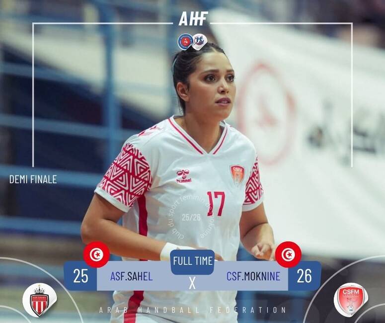 بلغ نادي الرياضة النسائية بالمكنين الدور النهائي للنسخة السابعة للبطولة العربية للاندية لكرة اليد للسيدات التي تحتضنها مدينة الحمامات الى غاية 9 نوفمبر الجاري اثر فوزه على الجمعية النسائية بلساحل بنتيجة 26-25 في المباراة التي اقيمت اليوم الجمعة لحساب الدور نصف النهائي.
