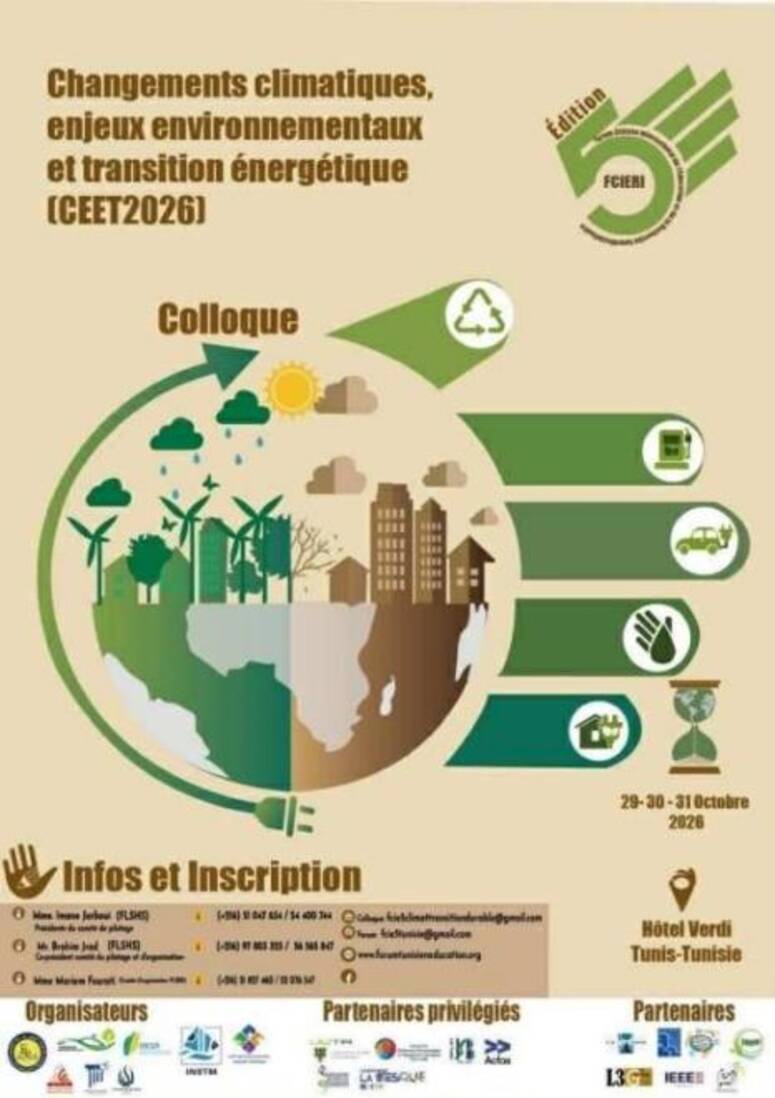 من المنتظر أن تحتضن تونس العاصمة، من 29 إلى 31 أكتوبر 2026، الندوة الدولية حول " التغيرات المناخية، القضايا البيئية والانتقال الطاقي"، التي ينظمها المركز الدولي للدراسات البيئية والتكنولوجية.