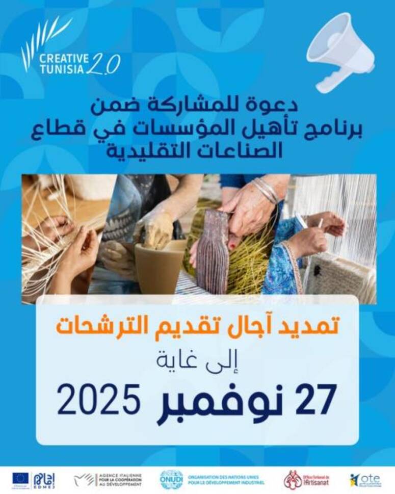 التمديد في اجل قبول المشاركة في برنامج تاهيل المؤسسات في قطاع الصناعات التقليدية الى 27 نوفمبر 2025