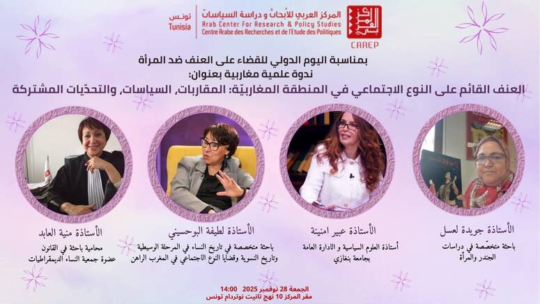 أجمعت المشاركات في الندوة العلمية المغاربية، التي التأمت اليوم الجمعة بالمركز العربي للأبحاث ودراسة السياسات بتونس تحت عنوان "العنف القائم على النوع الاجتماعي في المنطقة المغاربية: المقاربات، السياسات والتحديات المشتركة"، على أن تفاقم ظاهرة العنف المسلط على النساء في بلدان المغرب العربي يعود بالأساس إلى الأعراف والمعايير الاجتماعية التي تشرع التطبيع مع العنف، فضلا عن ضعف المنظومات التشريعية المخصّصة لمناهضة العنف ضد النساء.