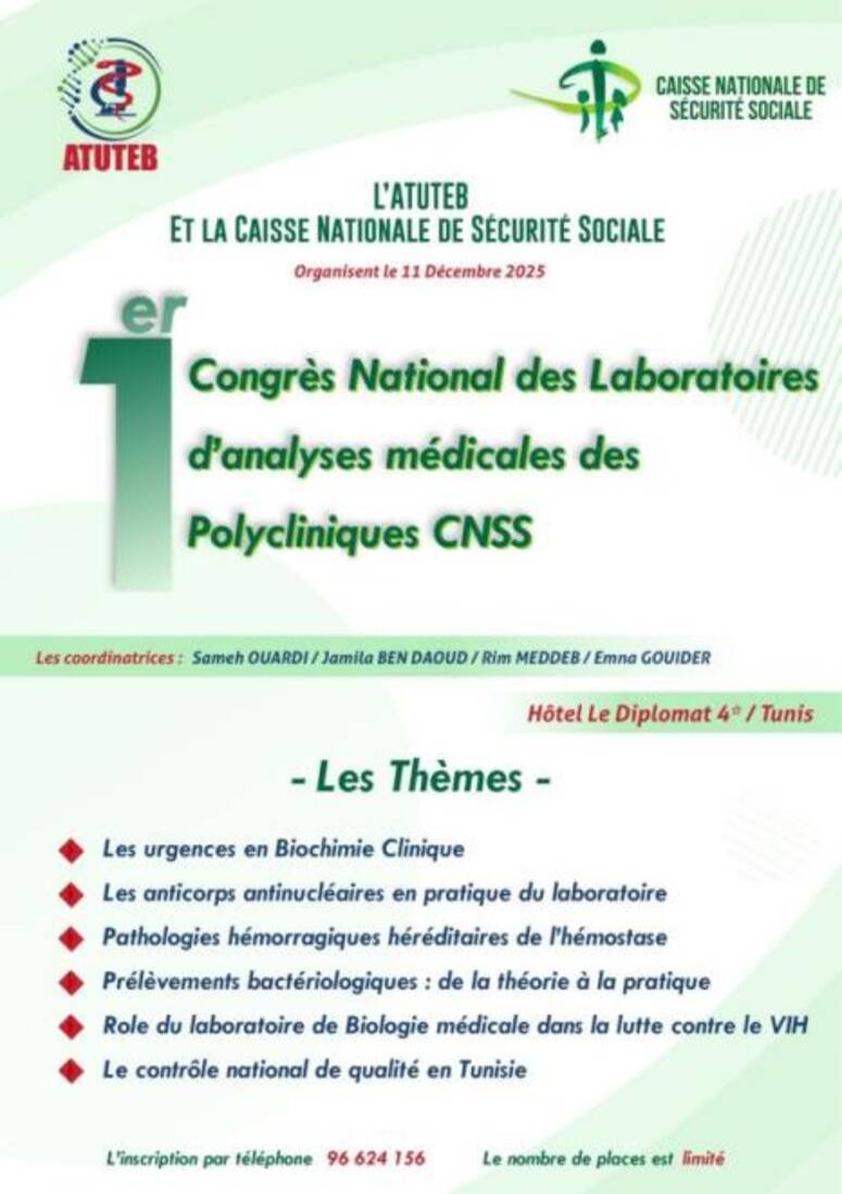 تنظم الجمعية التونسية للفنيين البيولوجيين بالشراكة مع الصندوق الوطني للضمان الاجتماعي، المؤتمر الوطني الاول لمخابر التحاليل الطبية لمصحات الصندوق، وذلك يوم الاربعاء 11 ديسمبر 2025 بتونس العاصمة.