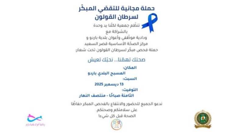 تنظم جمعية لكلنا يد وحدة بالشراكة مع ودادية موظفي وأعوان بلدية باردو ومركز الصحة الاساسية قصر السعيد، غدا السبت، حملة صحية مجانية للتقصي المبكر لسرطان القولون، وذللك بالمسبح البلدي بباردو