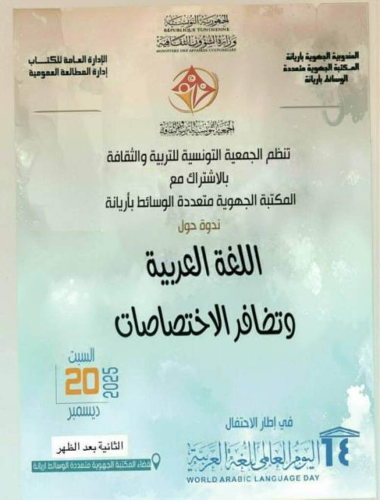 تنظم الجمعية التونسية للتربية والثقافة بالشراكة مع المكتبة الجهوية متعددة الوسائط بأريانة، ندوة حول " اللغة العربية وتضافر الاختصاصات"، يوم السبت 20 ديسمبر الجاري، بمقر المكتبة