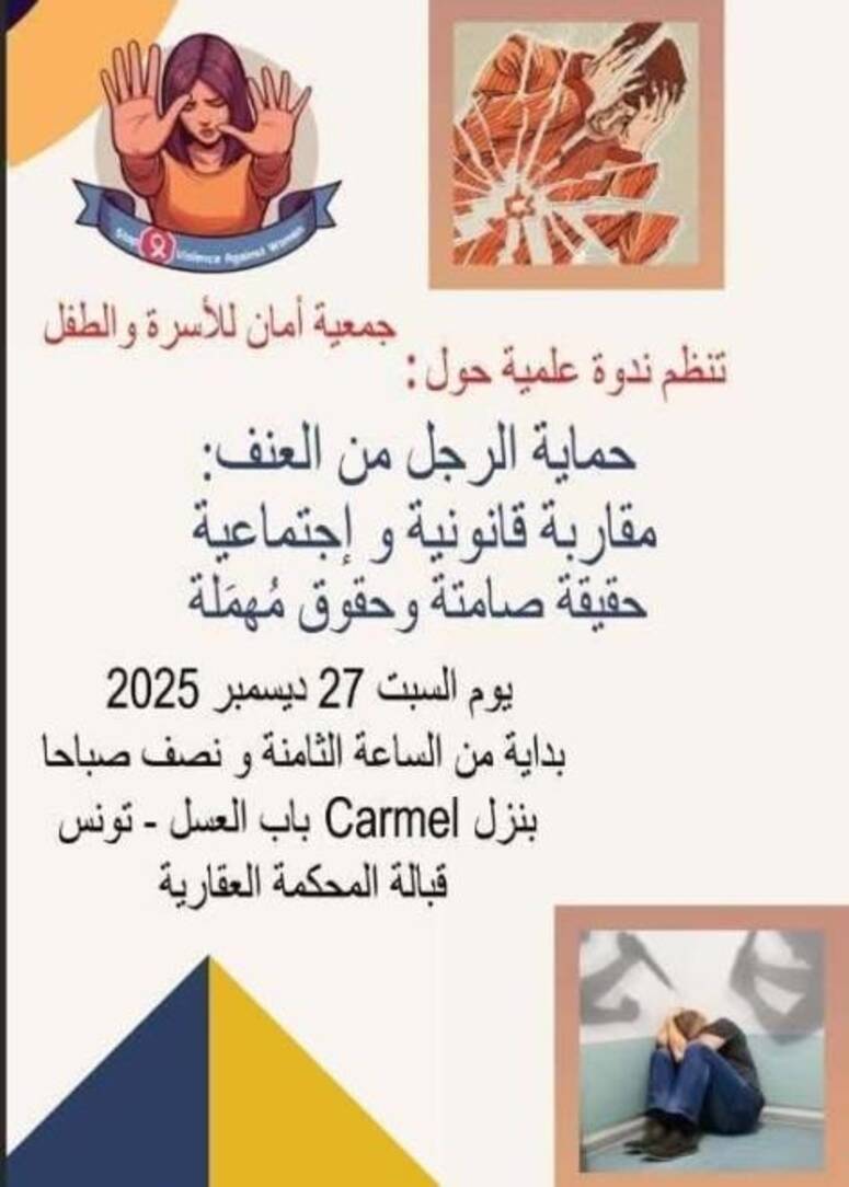 تنظم جمعية "أمان للأسرة والطفل" يوم 27 ديسمبر 2025 لقاء تحت عنوان "حماية الرجل من العنف" لتسليط الضوء على مختلف أوجه العنف المسلّط على الرّجل وتقديم قراءات قانونية واجتماعية.