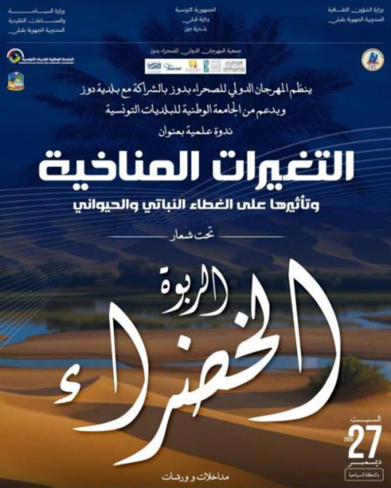 ينظم، المهرجان الدولي للصحراء بدوز، بالشراكة مع بلدية دوز وبدعم من، الجامعة الوطنية للبلديات التونسية، ندوة علمية بعنوان "التغيرات المناخية وتأثيرها على الغطاء النباتي والحيواني" تحت شعار "دوز الربوة الخضراء"، وذلك يوم 27 ديسمبر الجاري.