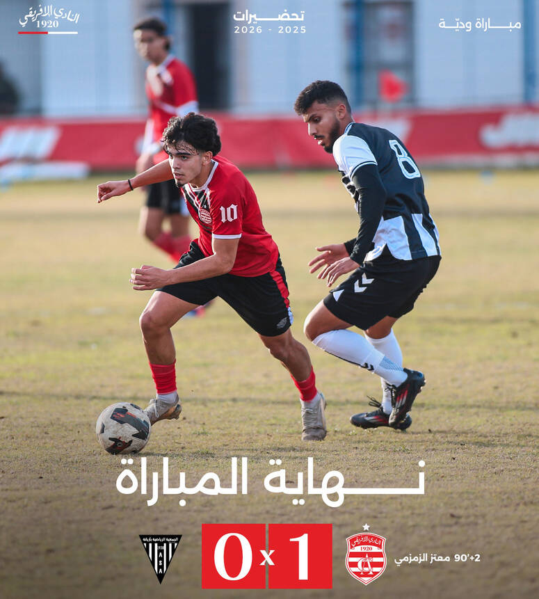 فاز النادي الافريقي على جمعية اريانة بنتيجة 1-0 في المباراة الودية لكرة القدم التي اقيمت اليوم الجمعة ضمن استعدادات الفريقين لاستئناف بقية الموسم الرياضي 2025-2026.