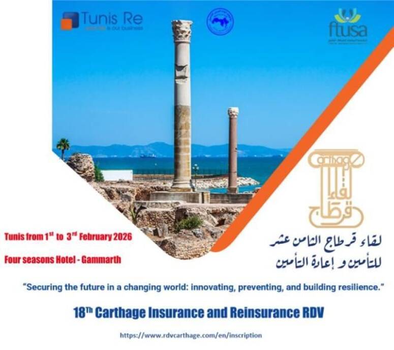 تحتضن تونس من 1 الى 3 فيفري 2026 اشغال ملتقى قرطاج الثامن عشر للتامين واعادة التامين تحت شعار "تأمين المستقبل في عالم متغير: تجديد، وقاية، صمود".