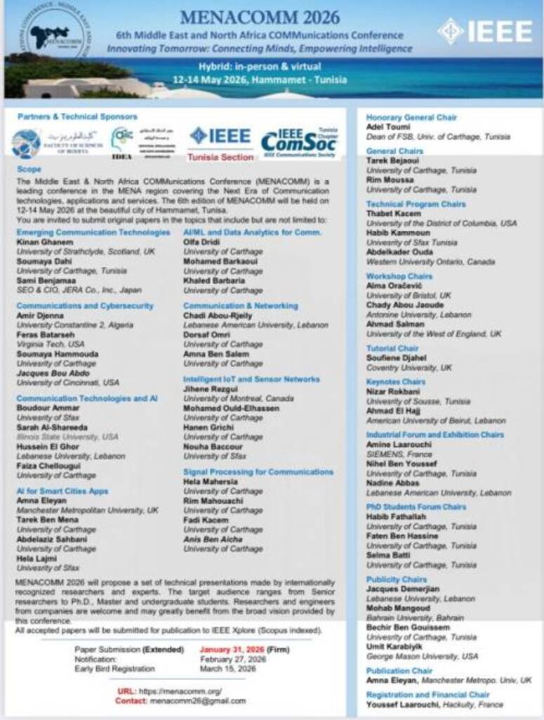 تنعقد الدورة السادسة لمؤتمر الاتصالات في الشرق الأوسط وشمال أفريقيا (MENACOMM) من 12 إلى 14 ماي 2026 في مدينة الحمامات.
