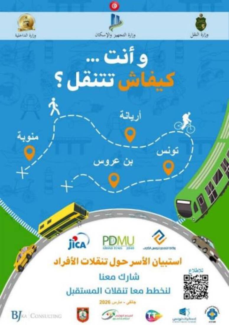 أعلنت وكالة التعمير لتونس الكبرى الراجعة بالنظر لوزارة التجهيز والإسكان عن انطلاق تنفيذ "الاستبيان الميداني للأسر حول تنقلات الأفراد" في الولايات الأربع لتونس الكبرى (تونس واريانة ومنوبة وبن عروس) خلال الفترة الممتدة من بداية شهر جانفي 2026 إلى موفي شهر مارس 2026.