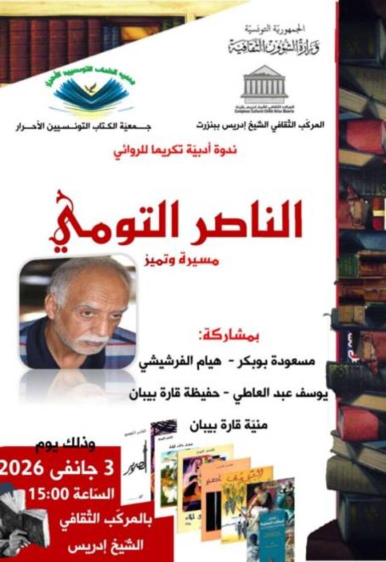 يحتضن المركب الثقافي الشيخ ادريس ببنزرت مساء غد السبت 3 جانفي (س15) ندوة أدبية ستكون مخصصة لتكريم الروائي الناصر التومي أصيل بنزرت.