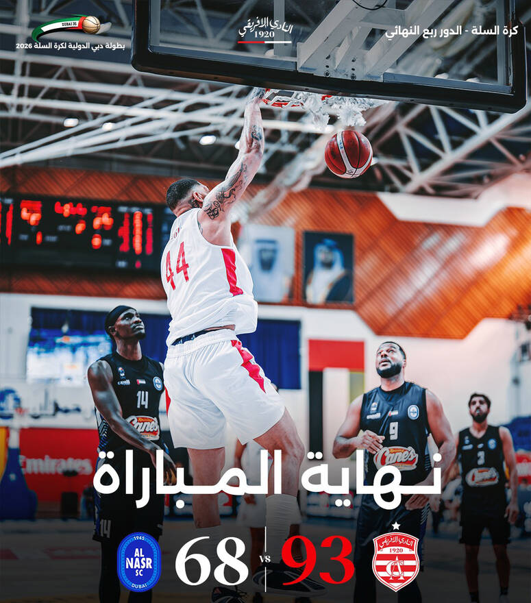 تأهّل النادي الإفريقي إلى الدور نصف النهائي من بطولة دبي الدولية لكرة السلة بعد فوزه اليوم على النصر الإماراتي بنتيجة 93-68 ضمن الدور ربع النهائي.