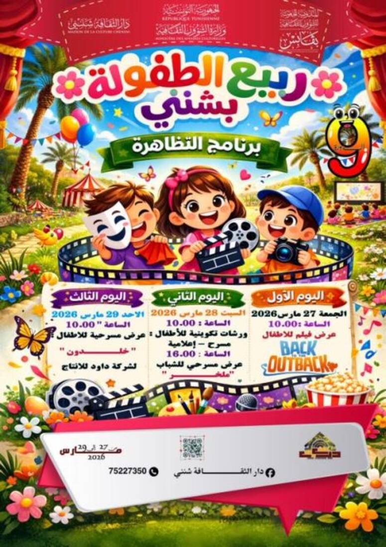 تنظم، دار الثقافة شنني، فعاليات الدورة التاسعة لتظاهرة "ربيع الطفولة بشنني"، وذلك من 27 الى 29 مارس 2026.