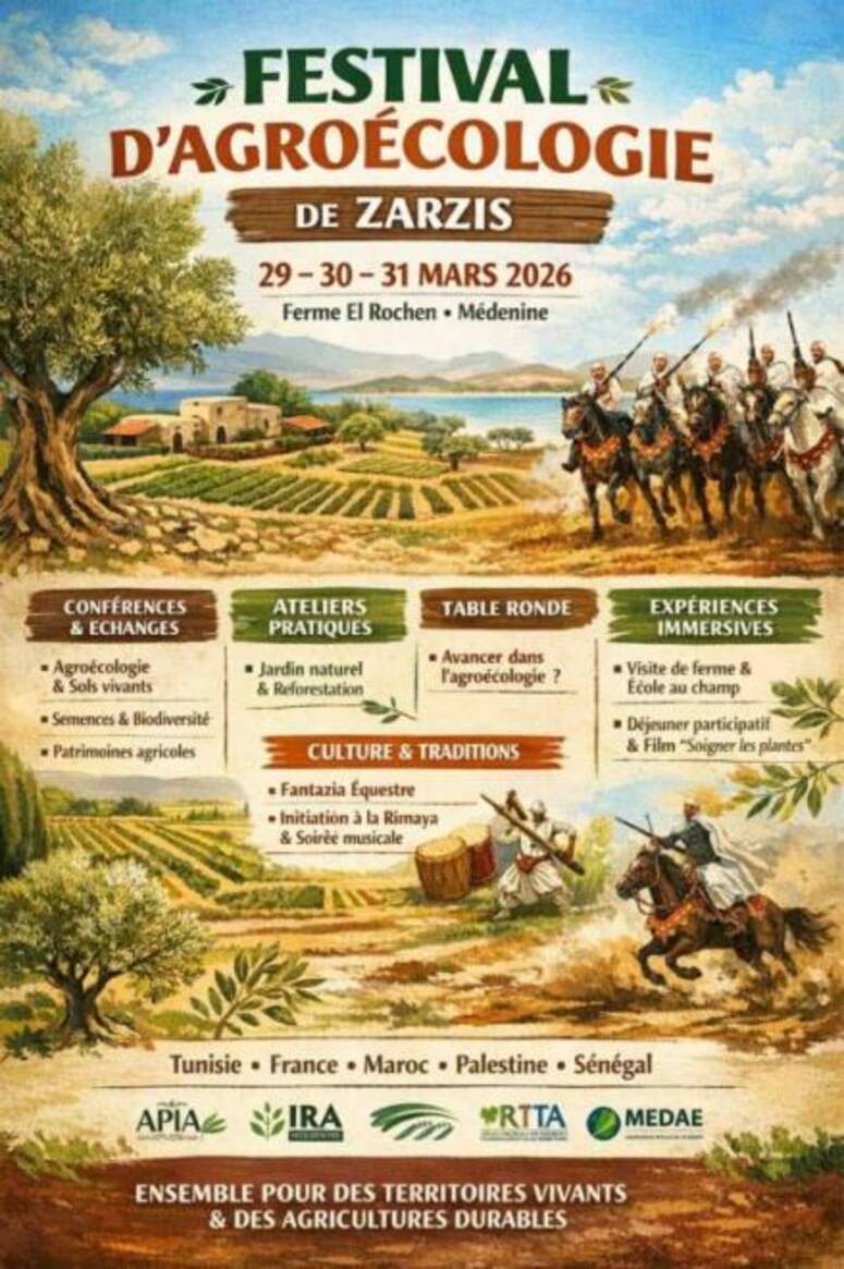 تحت شعار "معاً من أجل أراضٍ حيّة وزراعة مستدامة" تستعد مدينة جرجيس من ولاية مدنين، وتحديداً "ضيعة الروشن"، لاستضافة الدورة المقبلة من مهرجان الفلاحة البيئية، وذلك أيام 29 و30 و31 مارس 2026.