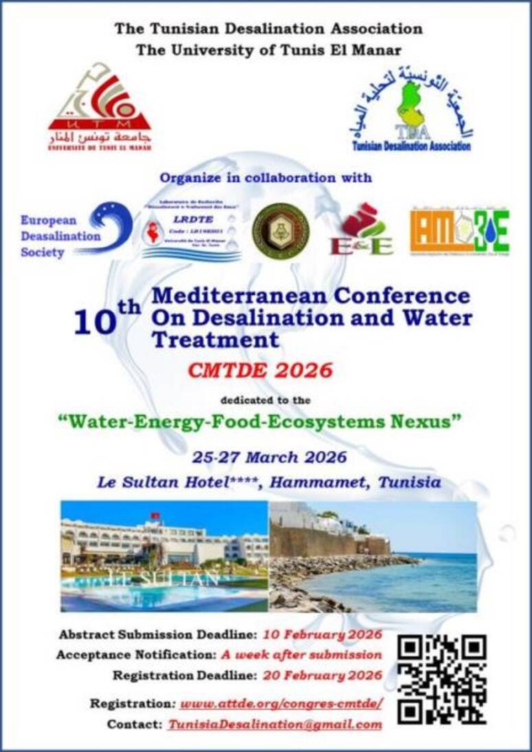 تنظم كل من، الجمعية التونسية لتحلية المياه وجامعة تونس المنار، الدورة العاشرة من، مؤتمر البحر الأبيض المتوسط لمعالجة المياه وتحليتها، وذلك من 25 إلى 27 مارس 2026 بمدينة الحمامات.