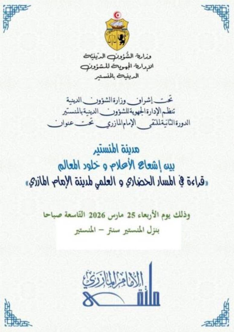 تنظّم الإدارة الجهوية للشؤون الدينية بالمنستير، يوم الأربعاء المقبل، الدورة الثانية لملتقى الإمام المازري تحت عنوان "مدينة المنستير بين إشعاع الأعلام وخلود المعالم: قراءة في المسار الحضاري والعلمي".