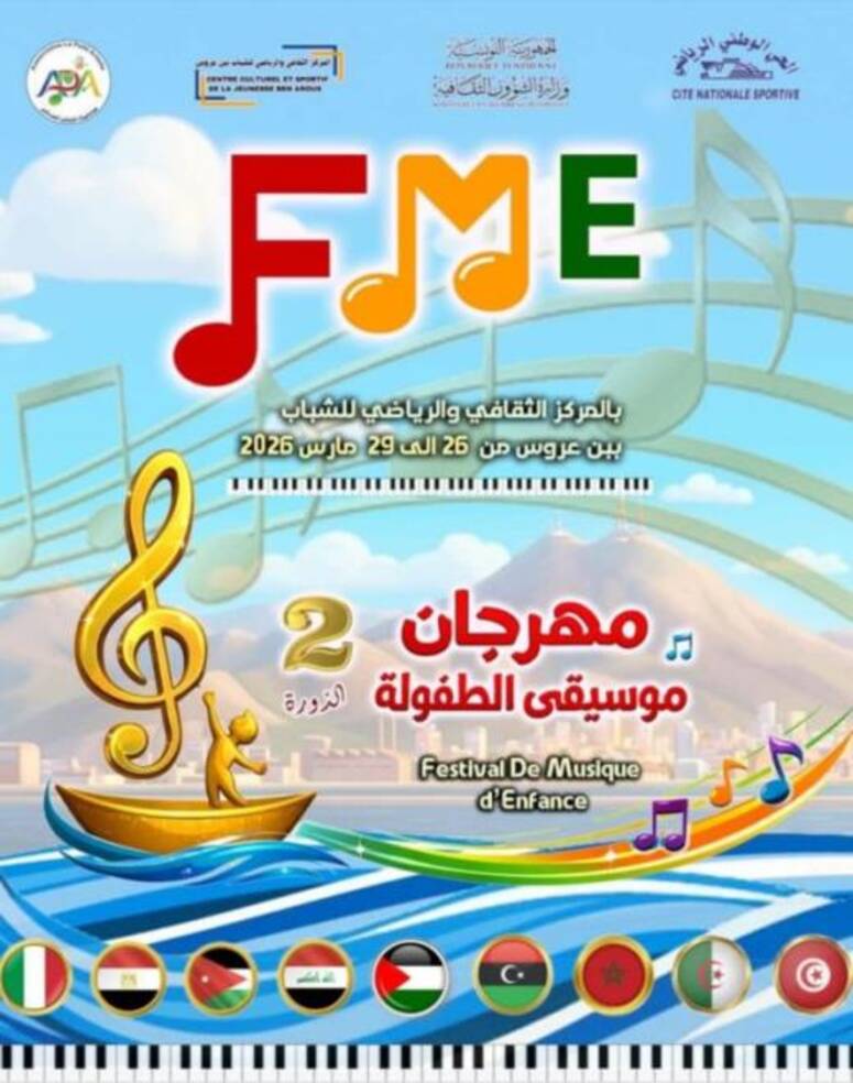 تنطلق فعاليات الدورة الثانية لمهرجان موسيقى الطفولة ببن عروس من 26 مارس الى غاية 29 مارس 2026 بالمركز الثقافي والرياضي للشباب ببن عروس .