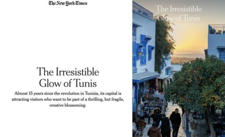 تحت عنوان "ألق تونس الذي لا يقاوم"، تصف الصحيفة حاضرة تونس التي تمثل ملتقى بين أوروبا وشمال إفريقيا والشرق الأوسط، حيث تشكل الحيوية الفنية والثقافية أجواء فريدة، من أسطح المدينة العتيقة إلى ضواحي سيدي بوسعيد والمرسى الراقية، تتعدد المتاجر ذات المفاهيم الفريدة وورشات "الموضة ذات النسق البطيئ" وتجمعات الفنانين، في حين يفسح النداء للصلاة، احيانا، المجال الى موسيقى "دي جي" التي تجمع بين الديسكو والمزود، هذه الموسيقى التقليدية ذات النغمات المميزة.