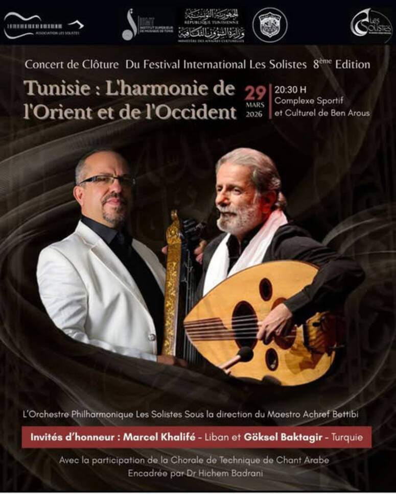 تختتم يوم الأحد 29 مارس 2026 فعاليات الدورة الثامنة للمهرجان الدولي "الصوليست" (العازفون المنفردون)، وذلك من خلال حفل يقام على الساعة الثامنة والنصف مساء بالمركز الثقافي للشباب ببن عروس.