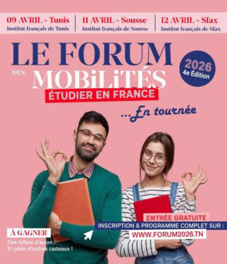 تنظم وكالة " كامبوس فرانس " ((Campus France Tunisie بالتعاون مع السفارة الفرنسية بتونس والمعهد الفرنسي بتونس، الدورة الرابعة من منتدى التنقل والدراسة بفرنسا، وذلك يوم الخميس 9 أفريل الجاري بالمعهد الفرنسي بتونس العاصمة