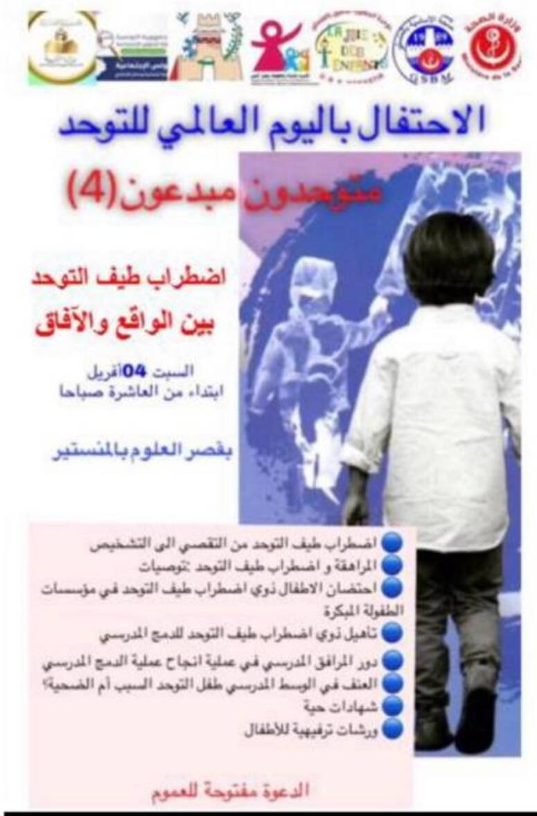 تنظم الوحدة الجهوية للتأهيل بالمنستير، تظاهرة احتفالية "متوحدون مبدعون" في دورتها الرابعة تحت عنوان " اضطراب طيف التوحد....الواقع والآفاق " وذلك يوم السبت 4 افريل الجاري بقصر العلوم بالمنستير