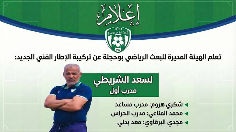 أعلن بعث بوحجلة المنتمي للمجموعة الاولى لبطولة الرابطة المحترفة الثانية لكرة القدم عن تعاقده مع المدرب لسعد الشريطي للاشراف على فريق الأكابر خلفا لوديع النقاز.