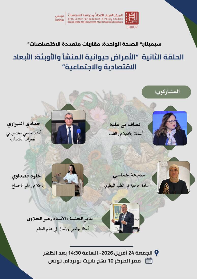 ينظم، المركز العربي للأبحاث ودراسة السياسات بتونس، الحلقة الثانية من سلسلة الندوات العلمية "الصحة الواحدة مقاربات متعددة الاختصاصات" والتي جاءت تحت عنوان "الأمراض حيوانية المنشأ والأوبئة: الأبعاد الاقتصادية والاجتماعية"، وذلك يوم الجمعة 24 أفريل 2026.