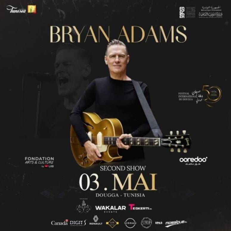 يحيي النجم الكندي العالمي براين آدامز حفلا فنيا ثانيا يوم 3 ماي 2026 على ركح مسرح دقة الأثري، وذلك ضمن فعاليات الدورة الخمسين من مهرجان دقة الدولي، وفق ما أعلنته الهيئة المديرة للمهرجان.