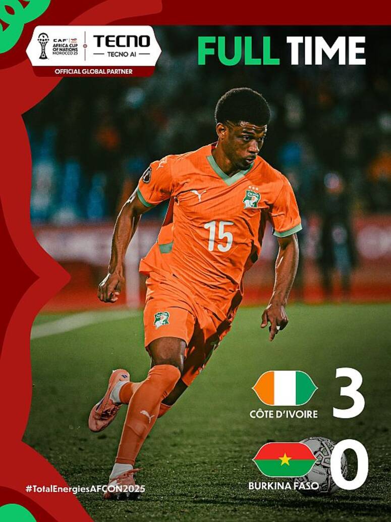 تأهّل منتخب كوت ديفوار إلى الدور ربع النهائي من كأس أمم إفريقيا 2025، بعد فوزه الواضح على منتخب بوركينا فاسو بثلاثة أهداف دون رد، في المباراة التي جمعتهما مساء اليوم على الملعب الكبير بمراكش، لحساب الدور ثمن النهائي.