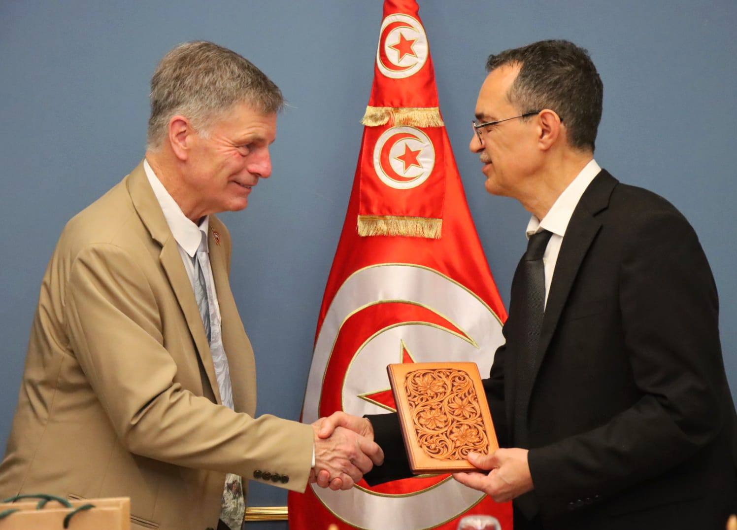 أكّد وزير الفلاحة والموارد المائيّة والصيد البحري، عزالدّين بن الشيخ، لدى لقائه اليوم الثلاثاء بمقر الوزارة، حاكم ولاية وايومنغ الامريكية، مارك غوردون، أهمية تعزيز الشراكة بين تونس والولايات المتحدة عبر تثمين صادرات القطاع الفلاحي نحو أمريكا على غرار التمور وزيت الزيتون، فضلا على تكثيف تبادل الخبرات والتجارب الناجحة، والاستفادة من أفضل الممارسات المعتمدة في تنفيذ البرامج والمشاريع التنموية.