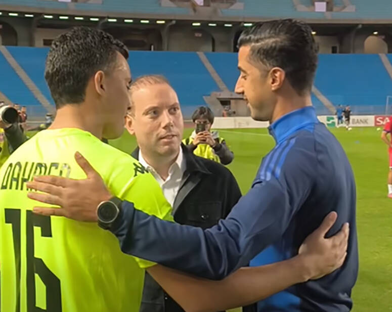 تصالح أيمن دحمان مع الحكم فرج عبد اللاوي قبل مباراة تونس وموريتانيا