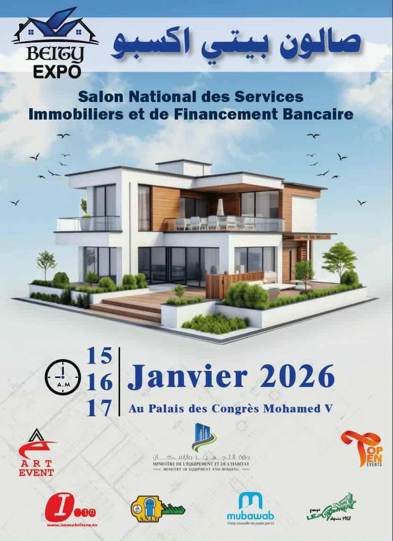 تحت إشراف وزارة التجهيز والإسكان، تنتظم الدورة الخامسة من الصالون الوطني للخدمات العقارية والتمويل البنكي “بيتي إكسبو 2026” أيام 15 و16 و17 جانفي 2026 بقصر المؤتمرات بالعاصمة، شارع محمد الخامس، في موعد يتجدّد ليؤكّد أهمية هذا الحدث كفضاء جامع لمختلف المتدخلين في القطاعين العقاري والمالي.