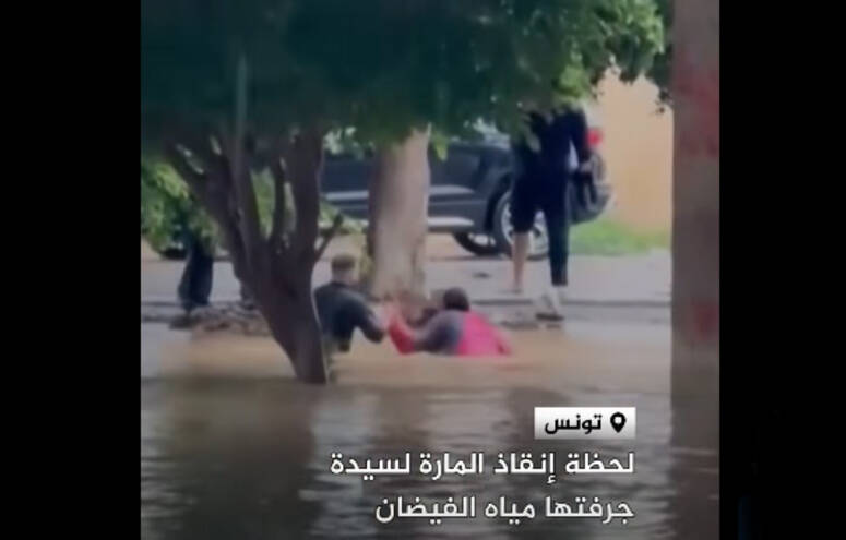 عرضت قناة الجزيرة مقطع فيديو يُظهر مواطنة جرفتها مياه السيول الفيضانية بأحد شوارع تونس، وسط محاولات من مواطنين لإنقاذها.